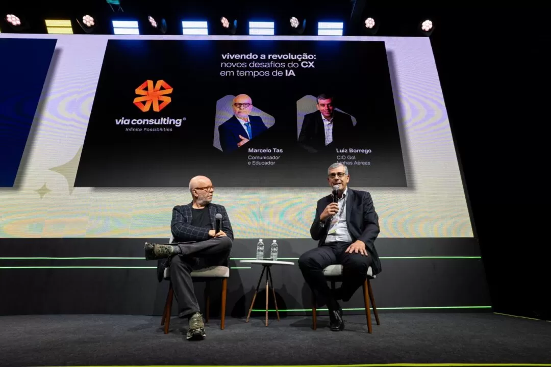 Na Plenária, os painéis tiveram início com a palestra de Tas, “Hackeando a Revolução Digital: como usar a IA a seu favor”. Em seguida, ele recebeu Luiz Borrego, CIO da Gol Linhas Aéreas — cliente da Via Consulting — para o talk “Vivendo a Revolução: novos desafios do CX em tempos de IA”.